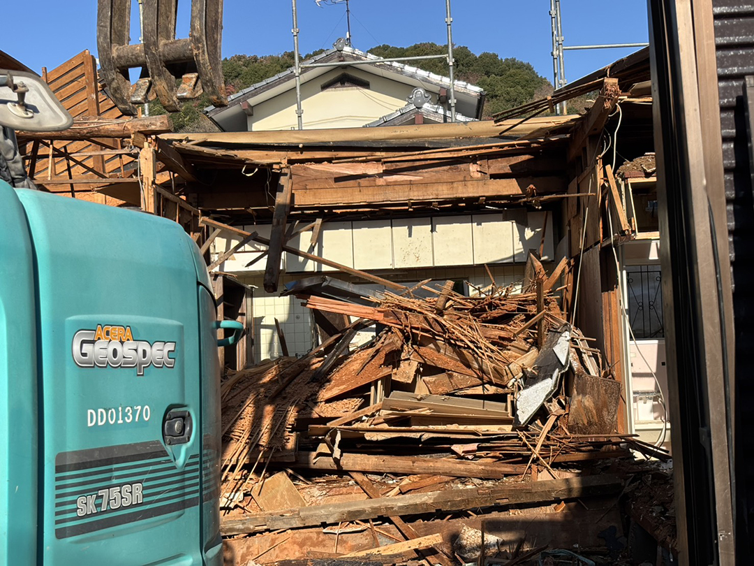 お世話になってるお客さまのおばあちゃんが亡くなり、そのままの状態で住めそうになかったのでお家を解体することになりました。土地が広いのは知っていましたが、解体後は予想以上に広い敷地でした。 解体後 解体後 解体前のお家 お家の解体中